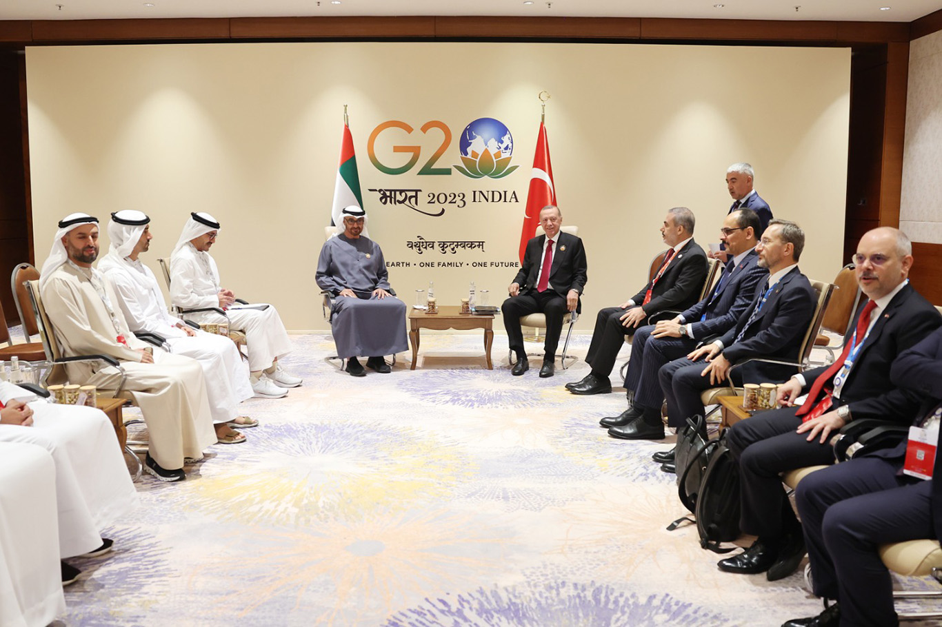 Cumhurbaşkanı Erdoğan, Bharat Mandapam Uluslararası Fuar ve Kongre Merkezi'nde "Tek Dünya" temasıyla gerçekleştirilen günün ilk oturumunun ardından BAE Devlet Başkanı Al Nahyan ile görüştü.