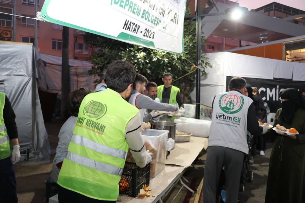 Hatay'da depremin ilk gününden itibaren yardım faaliyetlerini sürdüren Umut Kervanı Vakfı, Yetimler Vakfı, Avrupa Yetim Eli ve IHO-EBRAR, günlük 5-6 bin kişiye üç öğün sıcak yemek ikramında bulunuyor.
