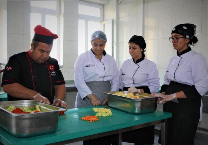 Öğrencilerden Negrican Aygün ise hedefi olan gastronomi bölümünde zorluk çekmemek için şeflerinden eğitim aldığını belirterek, “Şeflerimizle birlikte yemeklerimizi hazırlıyoruz. Köydeki kardeşlerimize sıcak ve temiz yemekleri gönderiyoruz. Akşam 9’a kadar burada mutfak işleriyle uğraşıyoruz. Şeflerimiz de doğradığımız ürünleri yemek yapıyorlar. Üniversitede hedefim gastronomi bölümü. Bu bölümde zorluk çekmemek için şeflerimizden eğitim alıyoruz” diye konuştu.