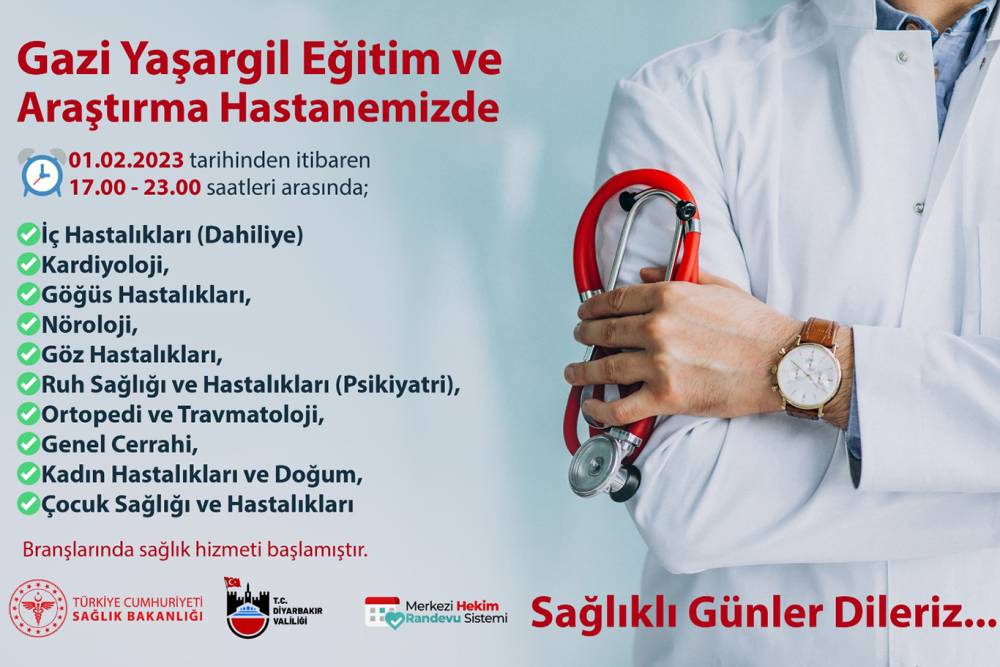 Diyarbakır Gazi Yaşargil Eğitim ve Araştırma Hastanesi'nde 1 şubat itibariyle İç hastalıkları, kardiyoloji, göğüs hastalıkları, nöroloji, göz hastalıkları, ruh sağlığı ve hastalıkları, ortopedi ve travmatoloji, genel cerrahi, kadın hastalıkları ve doğum ile çocuk sağlığı ve hastalıkları branşlarında 17.00-23.00 saatleri arasında hizmet vermeye başladı.