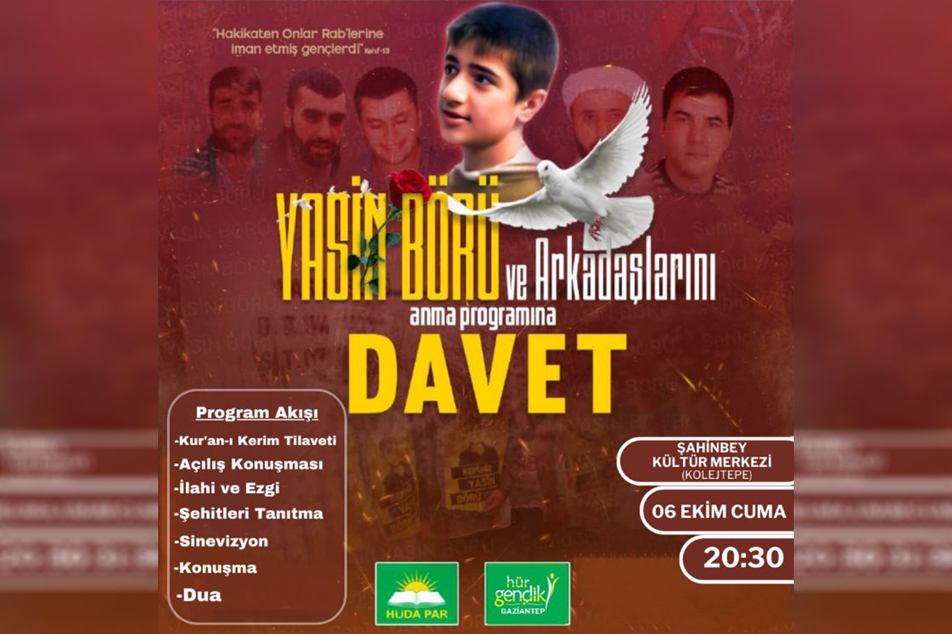 6 Ekim Cuma günü Şahinbey ilçesinin Kolejtepe Mahallesi'ndeki Şahinbey Kültür Merkezi'nde (Büyük Nikah Salonu) saat 20.30'da başlayacak olan anma programında şehid Yasin Börü ve arkadaşlarını yâd edeceklerini söyledi.