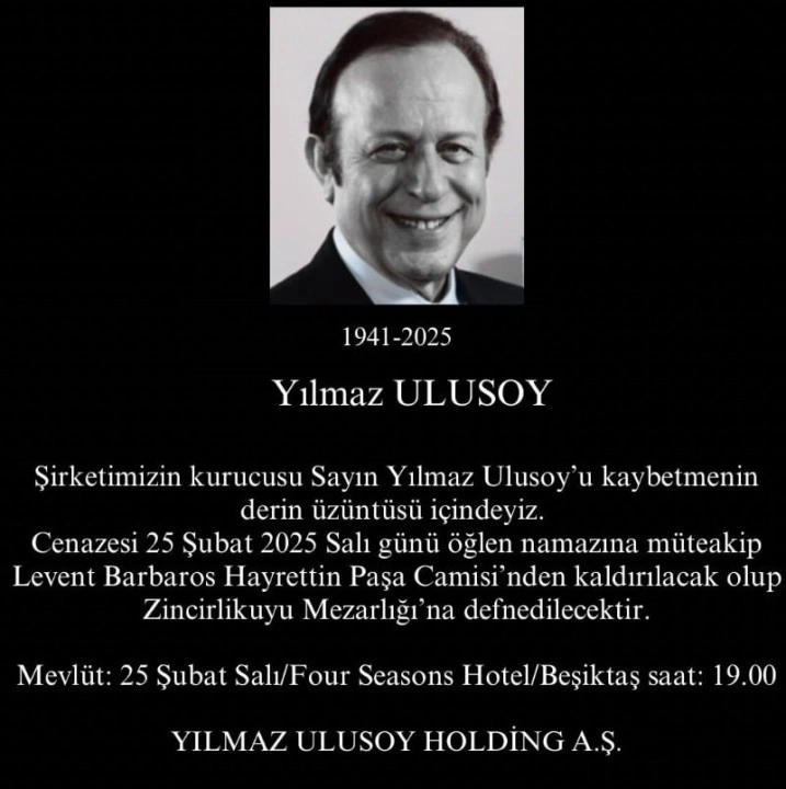 Yılmaz Ulusoy Holding’ten yapılan açıklamada, "Şirketimizin kurucusu Sayın Yılmaz Ulusoy’u kaybetmenin derin üzüntüsü içindeyiz. Cenazesi 25 Şubat 2025 Salı günü öğlen namazına müteakip Levent Barbaros Hayrettin Paşa Camisi’nden kaldırılacak olup Zincirlikuyu Mezarlığı’na defnedilecekti" denildi.