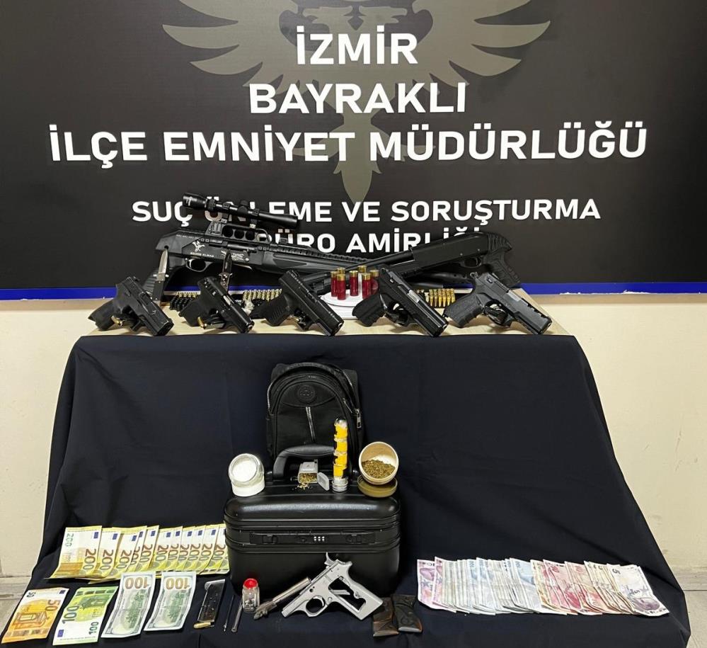 Bayraklı İlçe Emniyet Müdürlüğü Suç Önleme ve Soruşturma Büro Amirliği ekipleri, ilçede bulunan bir evde uyuşturucu madde ticareti yapıldığı ve silah bulunduğu ihbarı üzerine harekete geçti. Şüphelilerin izlendiği ve teknik takip yapıldığı bilgisi üzerine, sabah saatlerinde savcılıktan alınan talimatla operasyon düzenlendi. Adreste yapılan aramalarda ise 6 ruhsatsız tabanca, 2 pompalı tüfek, mühimmat, uyuşturucu maddeler, hassas terazi ve para ele geçirildi. Operasyon sonucunda A.M., A.Ç. ve S.Ö. isimli 3 şüpheli gözaltına alındı.