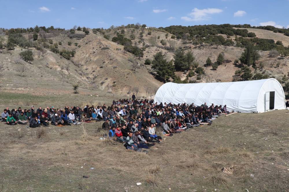 Cami cemaati, ağır hasar gören camide ibadet edemediği için bölgeye yakın bir alanda kurulan çadırda bir kez daha Cuma namazını eda etti.