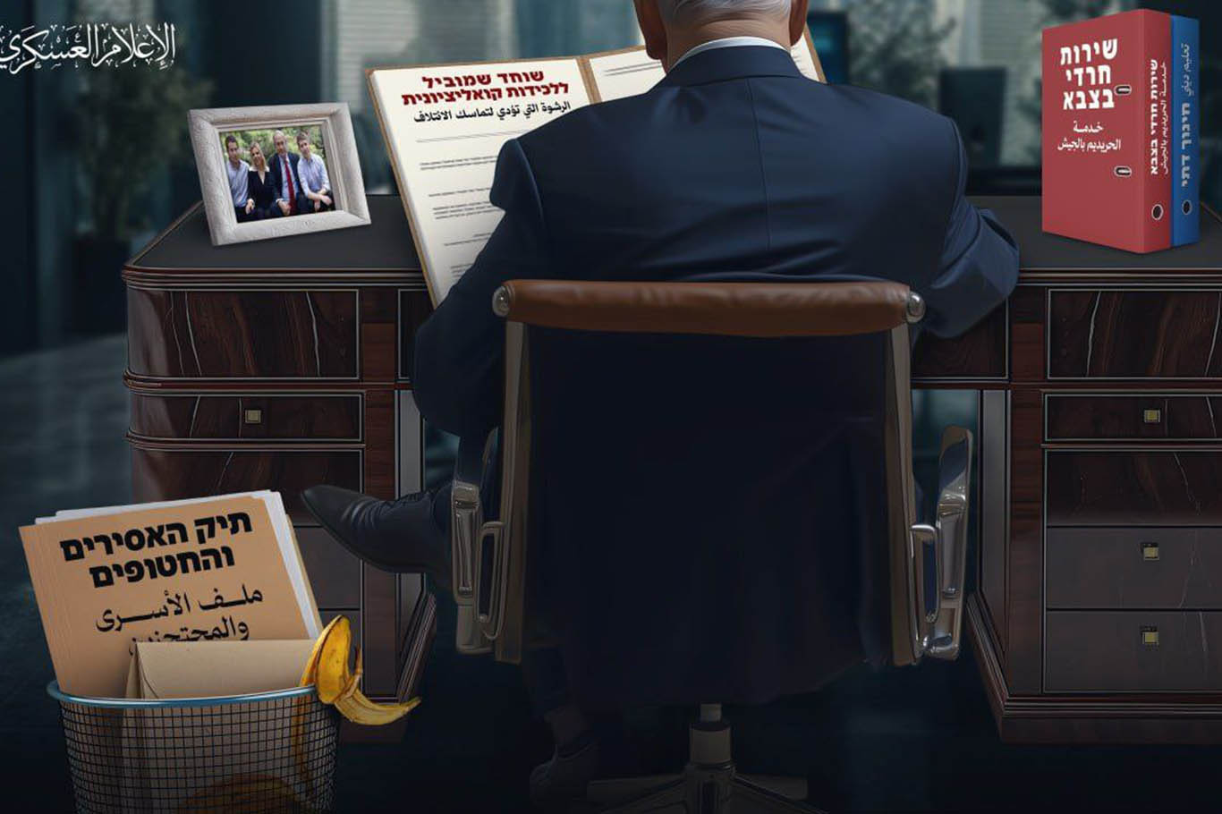 Görüntüde ayak ayak üstüne atmış halde bir masaya sırtı dönük vaziyette oturan işgal rejimi yöneticisi Netenyahu'nun elindeki dosyada "Hükümet koalisyonunun bütünlüğünü oluşturmak için rüşvet" yazarken masada da "dini eğitim" ve "Orduda Haredi hizmeti" yazılı dosyalar yer aldı.