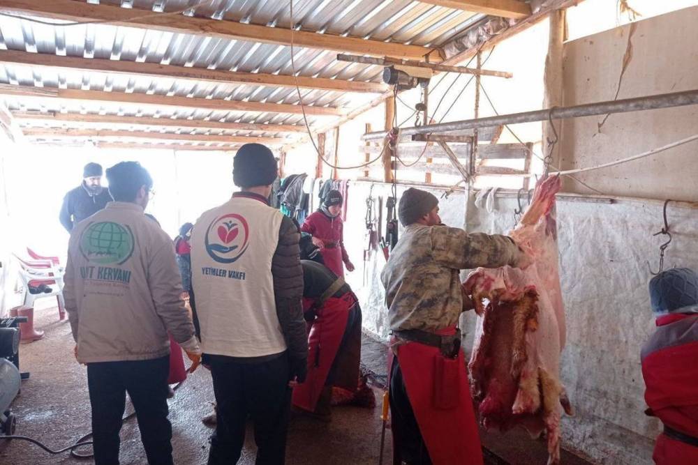 Adaklarını derneğe bağışlayan hayırseverlerin bu bağışlarıyla alınan kurbanlıkların kesimi gerçekleştirildi ve deprem bölgesine gönderilmek üzere hazırlandı. (İLKHA)