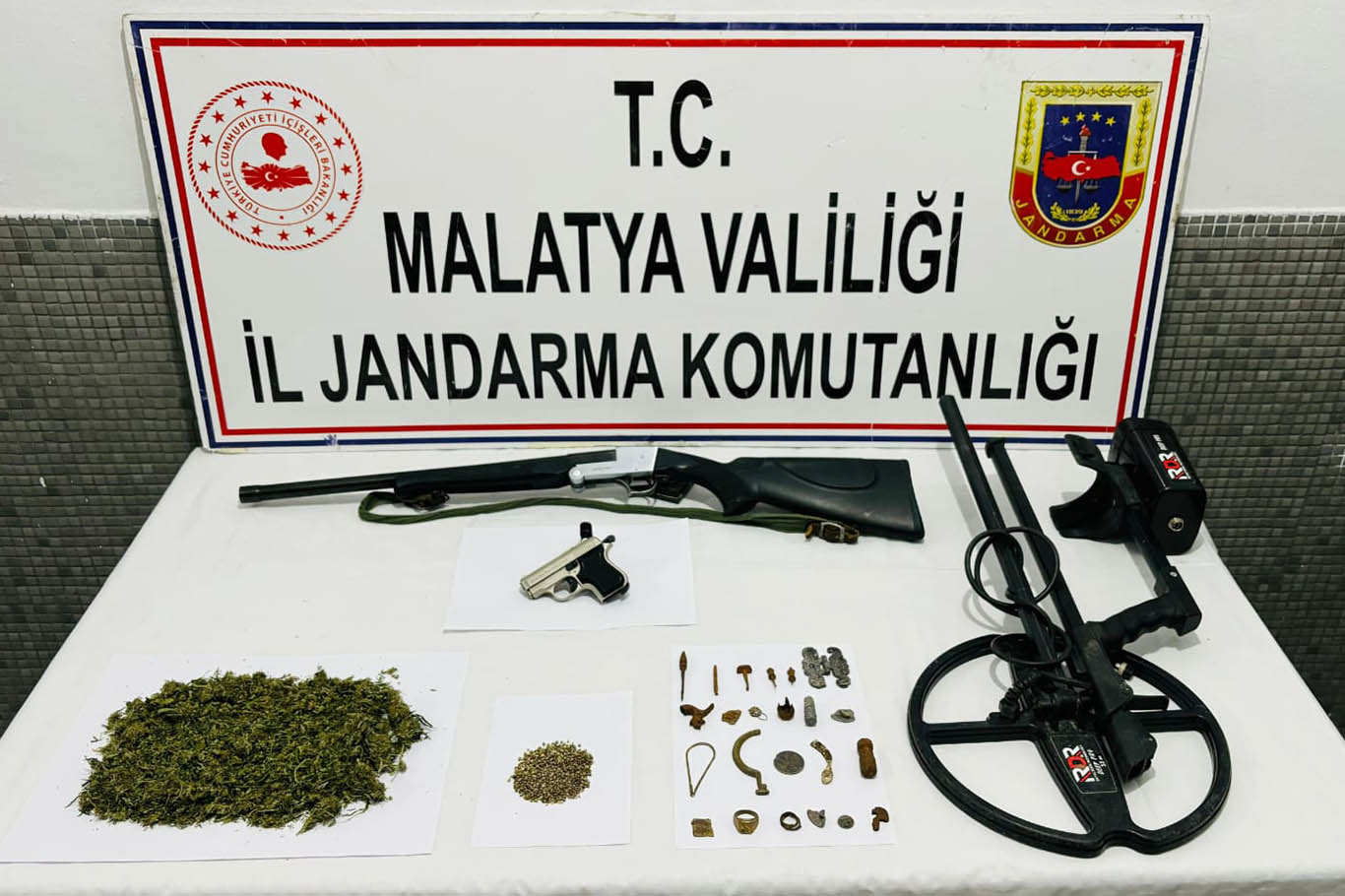 İkamette yapılan aramada, 471 gram kubar esrar, 45 gram kenevir tohumu, bir adet ruhsatsız 6.35 mm tabanca, bir adet dedektör, 29 adet tarihi eser niteliğinde obje ve 1 adet av tüfeği ele geçirildi.