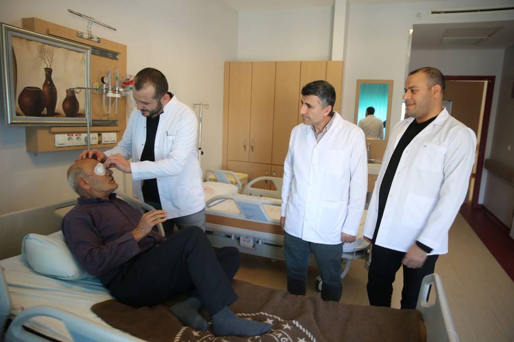 Hastanede ilk kez uygulanan yöntemle sağlığına kavuşan Çağıran'ı, Başhekim Yardımcısı Oktay Bulut ve ameliyatı yapan doktorlar ziyaret etti.