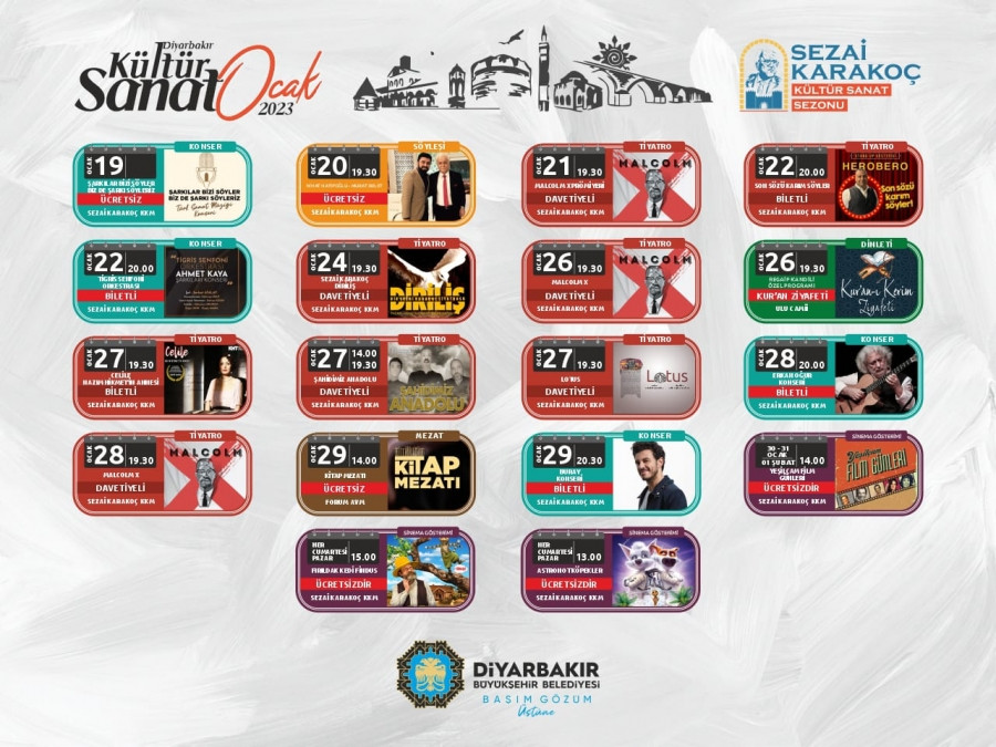 Diyarbakır Büyükşehir Belediyesi Kültür ve Sosyal İşler Daire Başkanlığı, hazırladığı 2023 Kültür ve Sanat Sezonu takvimi ile Diyarbakırlıları birbirinden güzel etkinlikler ile buluşturacak.