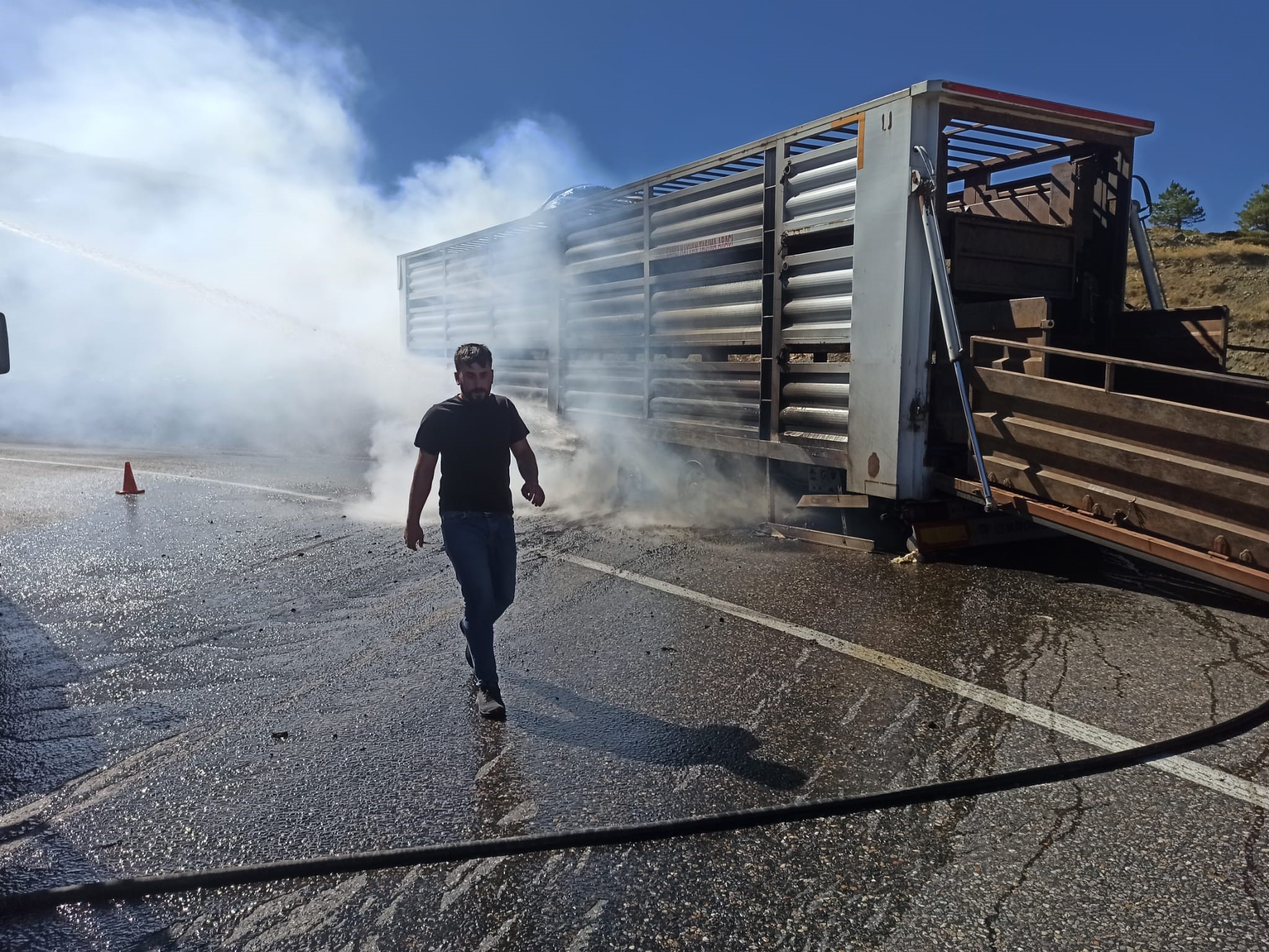 Olay, Tunceli’nin Pülümür ilçesi ile Erzincan sınırında yer alan Cankurtaran mevkiinde meydana geldi. Edinilen bilgiye göre seyir halindeki 21 AFJ 547 plakalı canlı hayvan taşıma acının lastiklerinde başlayan yangını fark eden sürücü, aracı kenara çekerek dorseyi gövdeden ayırdı. Durumun itfaiyeye bildirilmesi üzerine olay yerine Pülümür Belediyesi itfaiye ekipleri sevk edildi. Ekipler, dorseye sıçrayan yangını söndürürken aracın dorse bölümünde maddi hasar meydana geldi. Araçta canlı hayvan olmaması muhtemel bir faciayı önlerken, jandarma ekipleri olay yerinde inceleme yaptı.