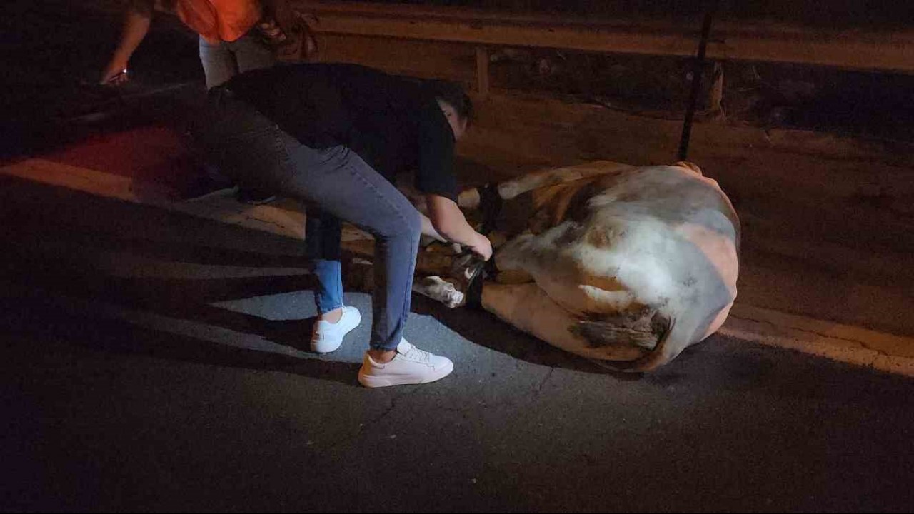 Hatay’da, tırın dorsesinden atlayarak otoyolda trafiği durduran bir angus, sakinleştirici iğne ile yakalandı.