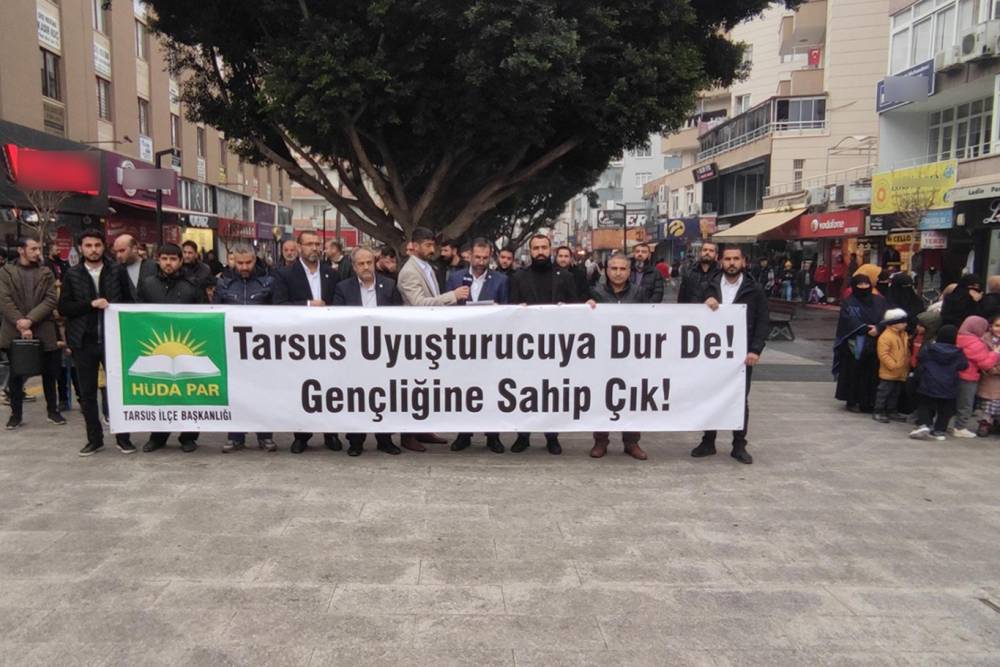 Uyuşturucuya karşı mücadele ve farkındalık oluşturmak amacıyla HÜDA PAR Mersin İl Başkanlığı tarafından gerçekleştirilen basın açıklamasını Tarsus İlçe Başkanı Hikmet Tanış okudu.