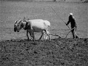 Mezopotamya ve Anadolu geleneğinden farklı olarak gelişen Mısır’da da ekonominin temelini tarım oluşturmaktadır. Doğal olarak bu olanağı Mısır coğrafyasına sağlayan Nil ırmağıdır. Nil Irmağı’nın belli aylardaki taşkınlığının sonrasında çekilen suların bıraktığı alüvyon bakımından zengin bataklık alanda, önceleri doğrudan tohum atılarak tarım yapılmaya başlanmış (Mısır’da tarımda saban kullanılmadan önce taşan Nil yatağının çekilmesinden sonra oluşan bataklık alana tohumların atıldığı ve domuzların bunları yemek için geldiklerinde, tırnakları sayesinde tohum tanelerinin çamurla kaplanmasını sağlayarak bu yolla yeşermesinin gerçekleştiği anlaşılıyor. Bu nedenle ekim ayına domuz-temmuz ayı denildiği ve bugünkü temmuz ayının isminin buradan geldiği düşünülmektedir) ancak sonraları ise bu alanların hayvan (boğa) gücüyle sürülmesi yöntemiyle tarım yapılmaya başladığını çeşitli betimlerden öğrenebilmekteyiz.