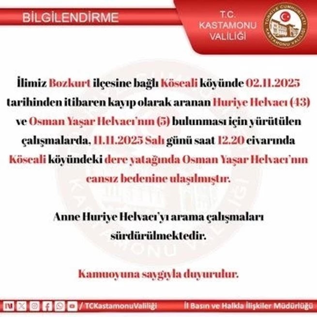 Kastamonu'nun Bozkurt ilçesinde 9 gündür annesi ile birlikte kayıp olan çocuktan acı haber geldi. 5 yaşındaki Osman Helvacı'nın cansız bedeni bulunurken anne Huriye Helvacı'yı arama çalışmaları devam ediyor...