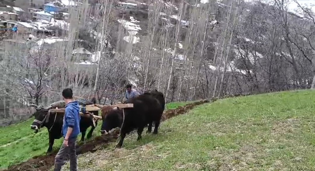 Van'ın Bahçesaray ilçesinde arazi şartları nedeniyle hala geleneksel tarım aleti olan 'Kara saban' kullanılıyor.