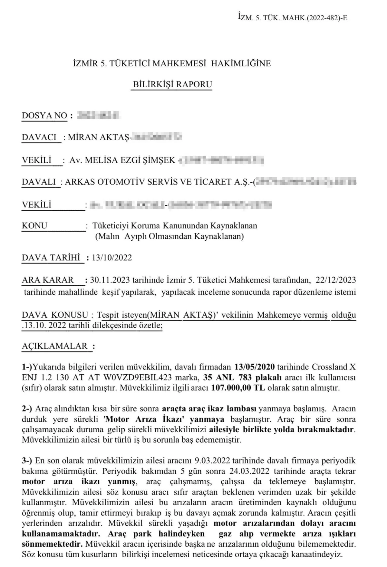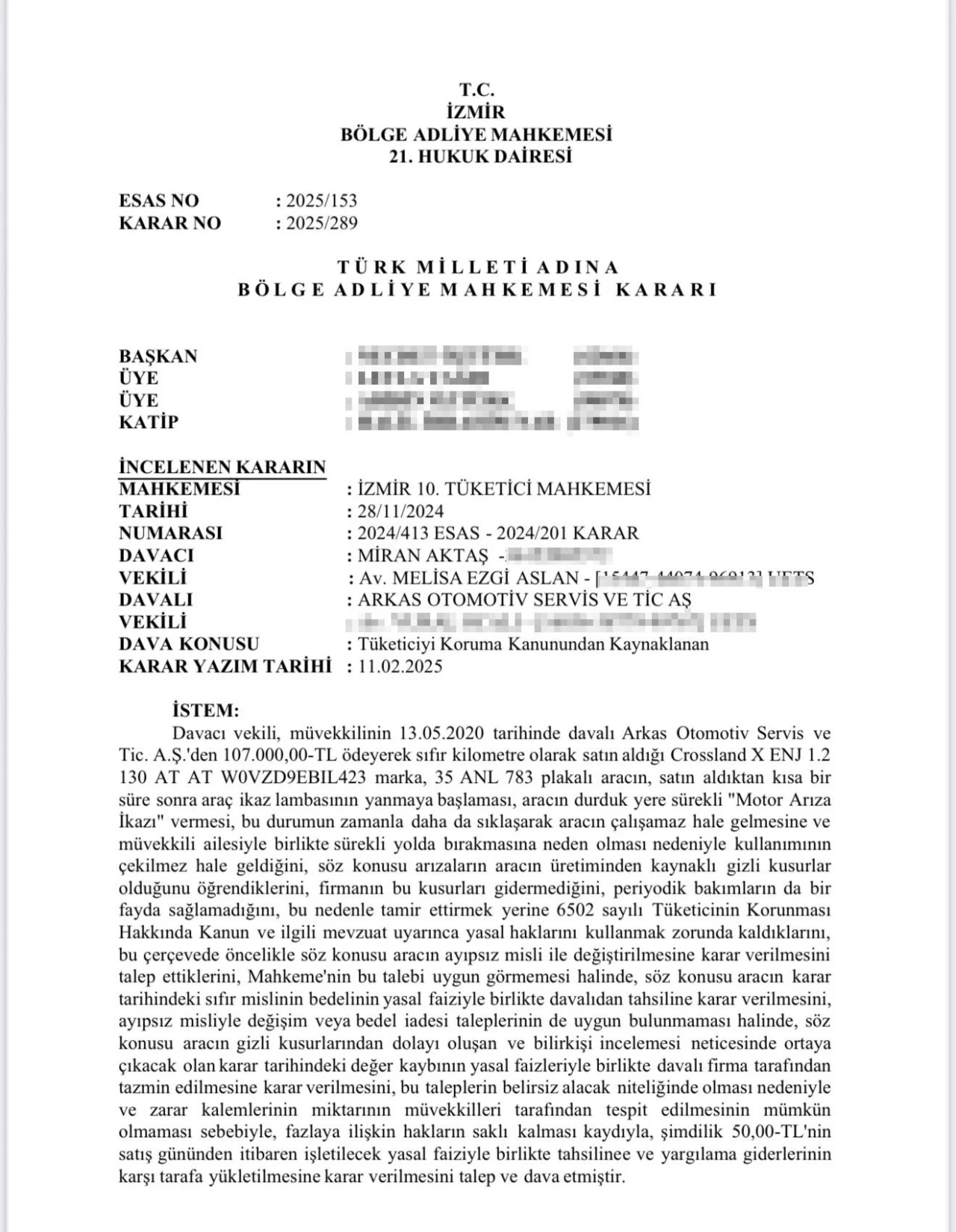 İzmir’de satın alınan Opel Crossland X marka aracın 5 yıldır devam eden arızaları, engelli bir ailenin hayatını zorlaştırıyor. Mahkeme süreci devam ederken aile, araçla yaşadıkları sıkıntının acilen çözülmesini talep ediyor.