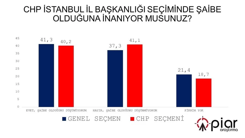 1/7 İstanbul 45. Asliye Hukuk Mahkemesi, 2 Eylül'de aldığı kararla, 8 Ekim 2023'te yapılan Cumhuriyet Halk Partisi (CHP) İstanbul 38. Olağan İl Kongresi'ni iptal etti. Yaşananlar Türkiye gündemine bomba gibi otururken, tartışmalara konu olan kayyum kararı CHP tarafından büyük tepki topladı. 2/7 PİAR Araştırma Şirketi, CHP İl Başkanlığı’na kayyum atanması ile ilgili bir anket düzenledi. Yapılan ankette vatandaşlara “CHP İl Başkanlığı seçiminde şaibe olduğuna inanıyor musunuz?” sorusu yöneltildi. 3/7 Seçimde şaibe olduğuna “evet” diyenlerin sayısı genel seçmenden "yüzde 41,3" olurken CHP seçmeninde ise "yüzde 40,2" oldu. 4/7 Seçimde şaibe olmadığını düşünenlerin sayısına bakıldığında da genel seçmende bu oran "yüzde 37,3" olarak görülürken, CHP seçmeninde ise "yüzde 41,1" oldu. 5/7 EVET DOĞRU BULUYORUM: Genel seçmen: %46,7 CHP seçmeni: %38,7 6/7 HAYIR DOĞRU BULMUYORUM: Genel seçmen: %38,9 CHP seçmeni: %39,4 7/7