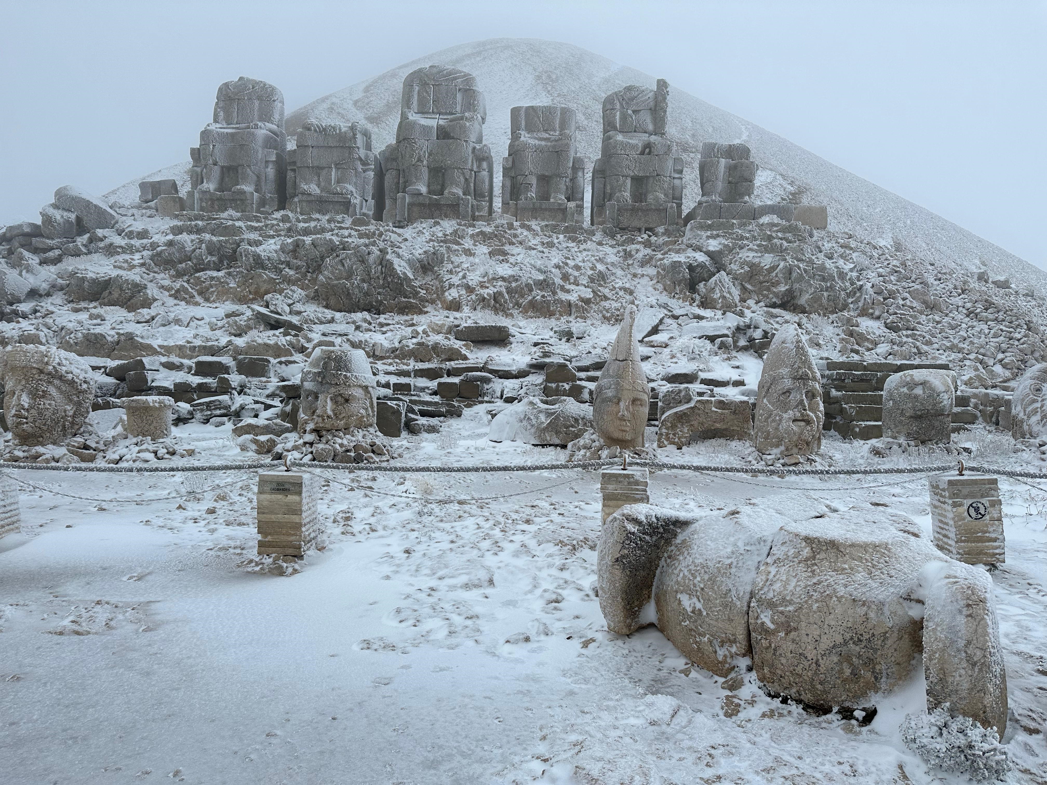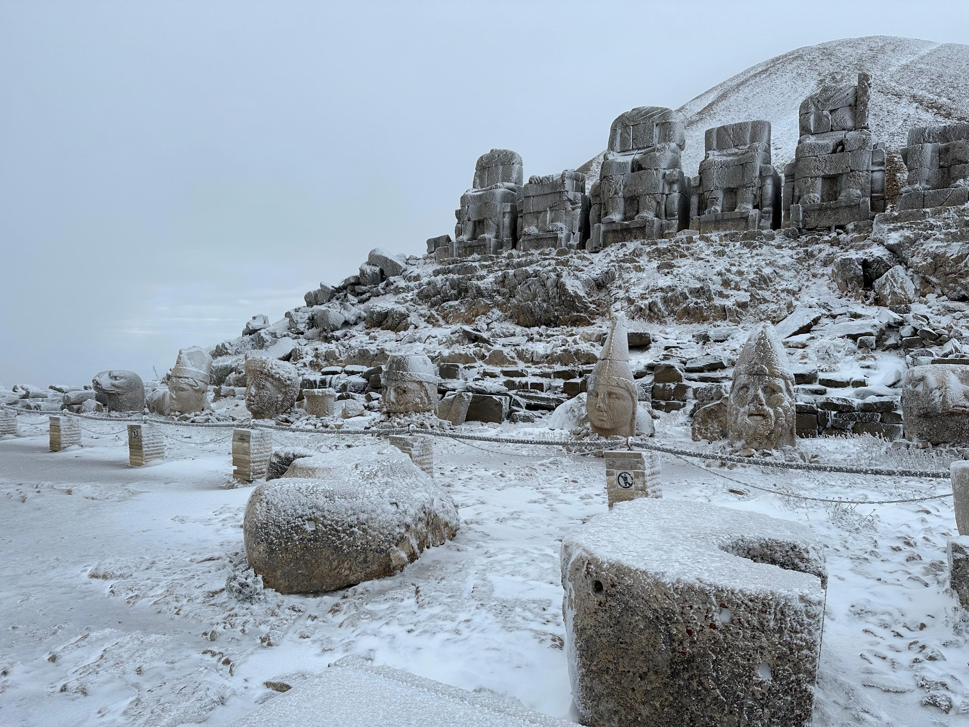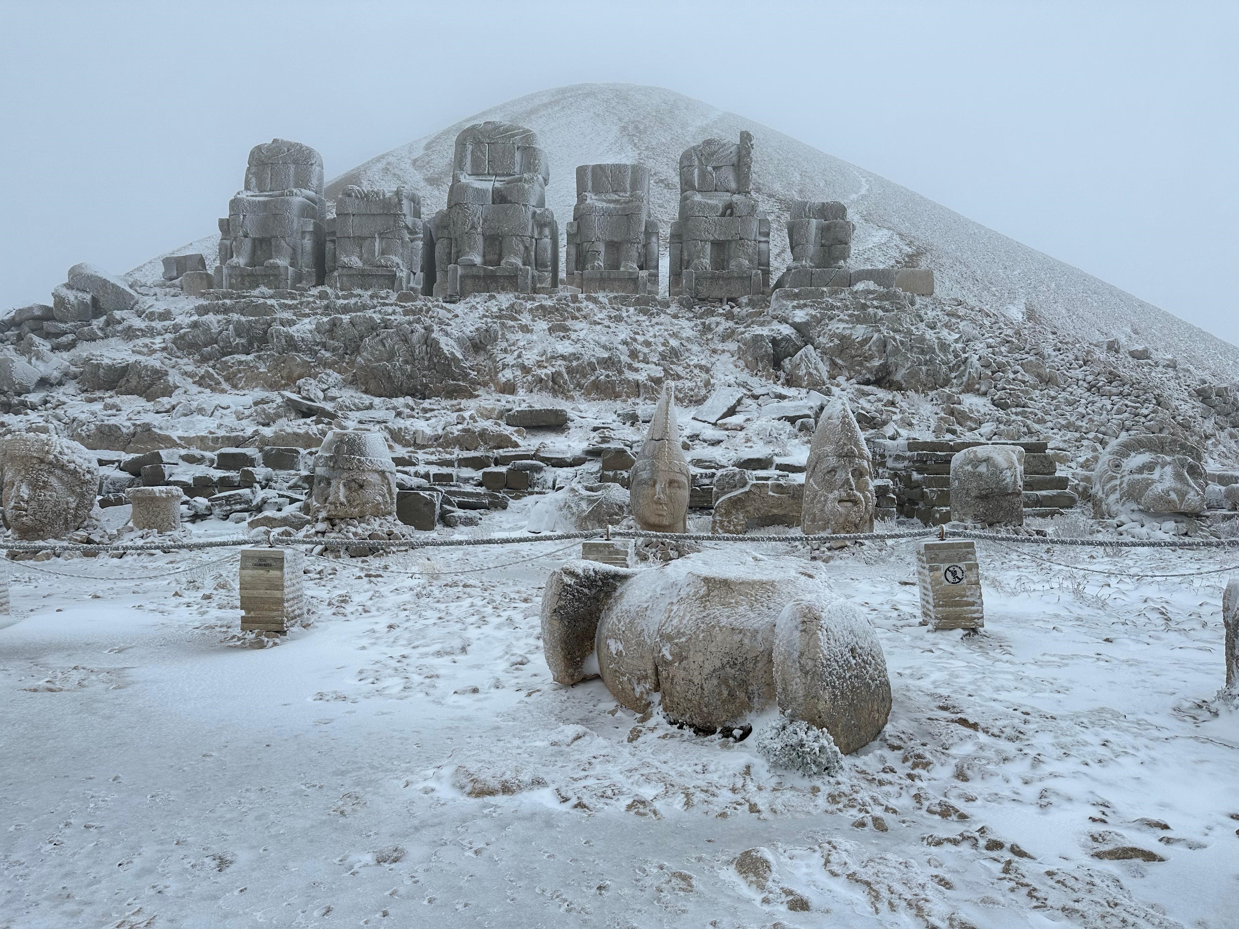 UNESCO’nun Dünya Kültür Mirası listesinde yer alan Nemrut Dağı’na sonbahar da kar yağdı. Adıyaman’da bulunan ve Dünya’nın 8. Harikası olarak kabul edilen 2 bin 206 metre yükseklikte ki Nemrut Dağı’na kar yağdı. Adıyaman’da iki günden beri etkili olan yağmur, Nemrut Dağı’nda kara dönüştü. Sabaha karşı yağmur yerini kara bıraktı.
