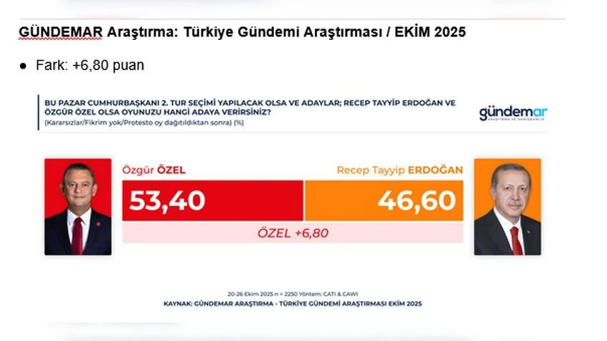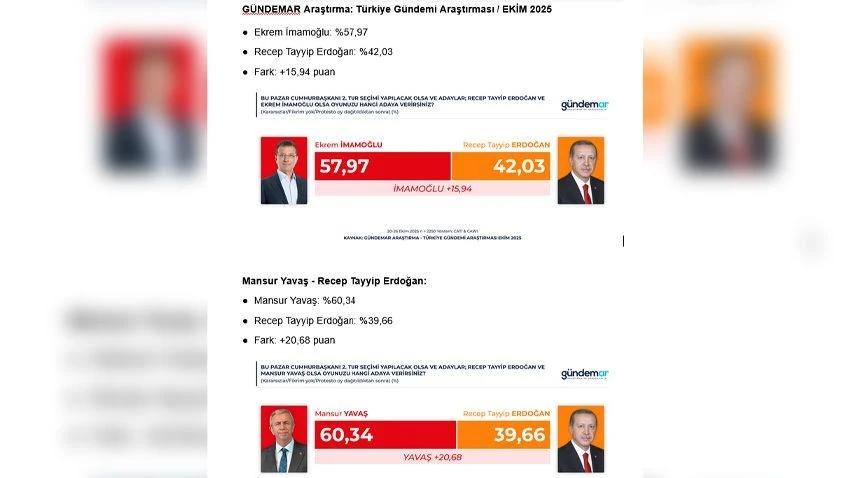 GÜNDEMAR'ın Ekim 2025 anketine göre Ekrem İmamoğlu, Cumhurbaşkanlığı yarışında Erdoğan’ın 15,94 puan önünde. Mansur Yavaş da 20,68, Özgür Özel ise 6,80 puan farkla önde olduğu iddia edildi.