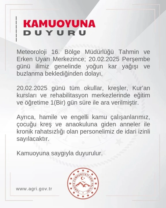 <div>Meteoroloji 16. Bölge Müdürlüğü Tahmin ve Erken Uyarı Merkezi’nden alınan bilgilere göre, 20 Şubat 2025 Perşembe günü Ağrı genelinde yoğun kar yağışı ve buzlanma beklentisi nedeniyle eğitim-öğretime bir gün ara verildi.</div><div>Ağrı Valiliği tarafından yapılan açıklamaya göre, 20 Şubat’ta tüm okullar, kreşler, Kur’an kursları ve rehabilitasyon merkezleri tatil edildi. Ayrıca, hamile ve engelli kamu çalışanları ile çocuğu kreş ve anaokuluna giden anneler ve kronik rahatsızlığı bulunan personel de idari izinli sayılacak.</div><div>Yoğun kar yağışı ve buzlanma nedeniyle vatandaşların ve çalışanların dikkatli olmaları ve gerekmedikçe dışarı çıkmamaları istendi.</div><div><b>Kaynak:</b> IHA</div>
