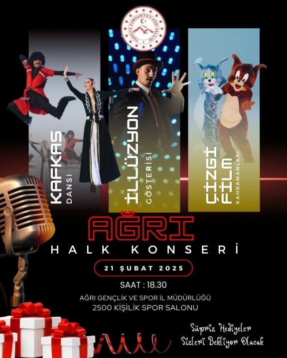 <div>Ağrı Valiliği tarafından "Ağrı Halk Konseri" etkinliği düzenlenecek.</div><div>Ağrı Valiliği tarafından 21 Şubat’ta düzenlenecek "Ağrı Halk Konseri"ne halkın ilgisinin yoğun olması beklenirken, etkinlikte Kafkas dansı gösterileri sahnelecek. Çocukların severek izlediği çizgi film kahramanlarının gösterileriyle de minikler eğlenceli bir gün geçirecek.</div><div><b>Kaynak:</b> IHA</div>
