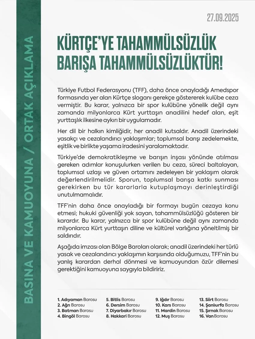 <h3>16 Baro'dan TFF'ye ‘Olağanüstü Toplantı’ Çağrısı</h3> <div></div> <div>Barolar, TFF'nin daha önce <strong>yazılı ve resmi onay verdiği</strong> bir forma reklamını, daha sonra <strong>"telefonla alınan sözlü talimat"</strong> gerekçe göstererek yasaklaması ve ceza kesmesini sert bir dille eleştirdi. Bu durum, hukuki çevrelerde <strong>"Türk futbolunda sözlü hukuk rejimine geçiş"</strong> olarak yorumlandı.</div> <div></div> <div>Baroların ortak açıklamasının odağındaki en sansasyonel başlıklar şunlar oldu:</div> <div><strong>Hukuki Güvenlik Krizi:</strong> Barolar, TFF'nin kendi verdiği yazılı kararlarla çelişen uygulamalarının <strong>hukuki güvenlik ilkesini</strong> ağır biçimde ihlal ettiğini savundu.</div> <div><strong>Yetki Aşımı:</strong> TFF Disiplin Kurulu'nun, hukuken açıkça yasaklanmamış bir fiil üzerinden ceza keserek <strong>yetki sınırlarını aştığı</strong> iddia edildi.</div> <div><strong>Kararın İptali Talebi:</strong> 16 Baro, TFF'yi karardan derhal dönmeye ve ülke futbolunda yaşanan bu <strong>güven krizini</strong> gidermek için şeffaf bir mekanizma kurmaya çağırdı.</div>