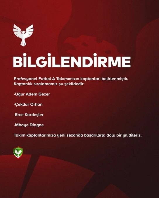 <div data-end="354" data-start="181"></div> <div data-end="375" data-start="358">Uğur Adem Gezer</div> <div data-end="392" data-start="378">Çekdar Orhan</div> <div data-end="411" data-start="395">Erce Kardeşler</div> <div data-end="428" data-start="414">Mbaye Diagne</div> <div></div> <div data-end="596" data-start="430">Kulüp, kaptanlarına yeni sezonda başarılarla dolu bir yıl dilediğini belirtti. Bu atama ile takımın saha içi liderliği ve disiplininin güçlendirilmesi hedefleniyor.</div>