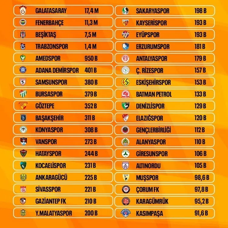 <h3>Bursaspor’u Geride Bıraktı!</h3> <div>Diyarbakır temsilcisi Amedspor, 950 bin takipçi sayısıyla Türkiye'nin köklü kulüplerinden Bursaspor'u (379 bin) ikiye katlayarak dikkatleri üzerine çekti.</div> <div></div> <div><strong>İşte Instagram'da en çok takip edilen ilk 10 futbol kulübü:</strong></div> <div><strong>Galatasaray:</strong> 17.4 milyon</div> <div><strong>Fenerbahçe:</strong> 11.3 milyon</div> <div><strong>Beşiktaş:</strong> 7.5 milyon</div> <div><strong>Trabzonspor:</strong> 1.4 milyon</div> <div><strong>Amedspor:</strong> 950 bin</div> <div><strong>Adana Demirspor:</strong> 401 bin</div> <div><strong>Samsunspor:</strong> 380 bin</div> <div><strong>Bursaspor:</strong> 379 bin</div> <div><strong>Göztepe:</strong> 352 bin</div> <div><strong>Başakşehir:</strong> 311 bin</div>