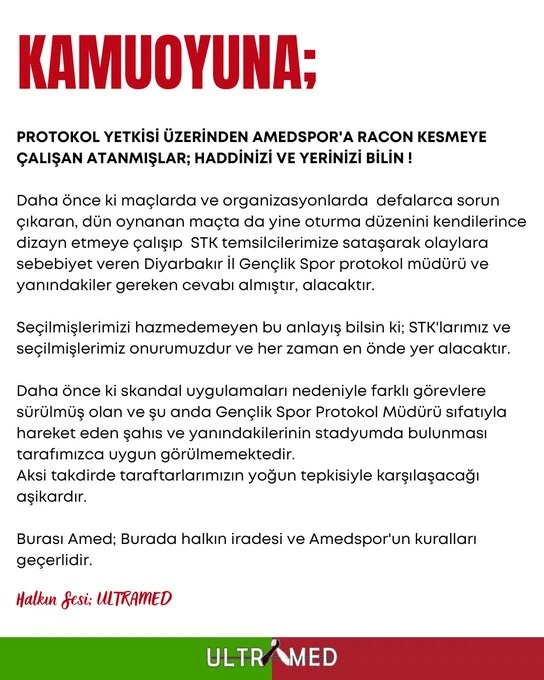 <div data-end="481" data-start="400"><strong data-end="479" data-start="400">“Amedspor’a racon kesmeye çalışan atanmışlar! Haddinizi ve yerinizi bilin.”</strong></div> <div data-end="680" data-start="483">Kulüp yönetiminin imzasıyla yayınlanan açıklama, sosyal medyada kısa sürede gündem oldu. Taraftarlar, Amedspor’un bu dik duruşunu alkışlarken, mesajın muhataplarının kim olduğu merak konusu oldu.</div> <div data-end="680" data-start="483"></div> <div data-end="860" data-start="682">Amedspor’un rest gibi açıklamasıyla birlikte gözler şimdi protokol krizinin perde arkasına çevrildi. Spor kamuoyunda “Amedspor’a kim racon kesmeye kalktı?” sorusu yankılanıyor.</div>