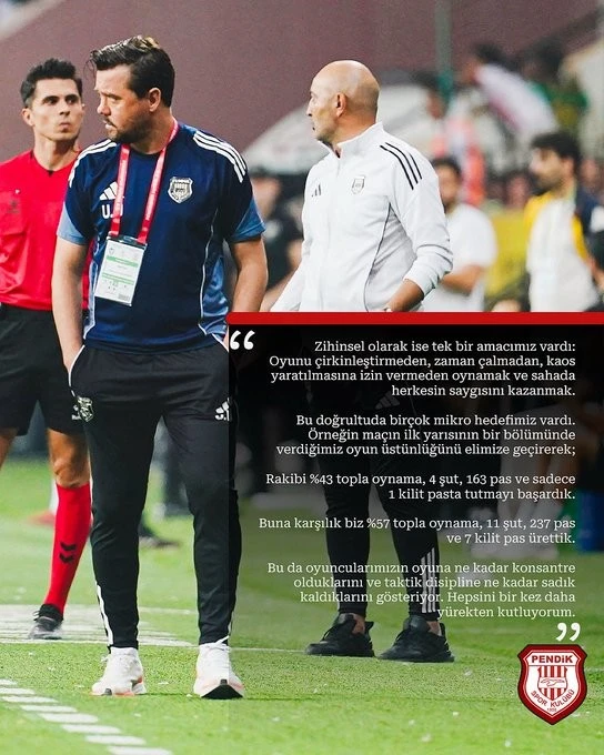<div data-end="476" data-start="353">Uçar, hem fiziksel hem de stratejik açıdan yoğun bir hazırlık sürecinden geçtiklerini vurgulayarak şu ifadeleri kullandı:</div> <div data-end="652" data-start="478"><strong data-end="650" data-start="478">“Hem fiziksel hem de stratejik olarak iyi hazırlandığımız bir maçı geride bıraktık. Bu hazırlığın, oyuncularımızla da ortak bir zeminde buluşması bizim için önemliydi.”</strong></div> <div data-end="652" data-start="478"><strong data-end="650" data-start="478"></strong></div> <div data-end="837" data-start="654">Deneyimli teknik adamın bu açıklamaları, Pendikspor’un maçtaki disiplinli görüntüsünü öne çıkarırken, karşılaşmaya hazırlık sürecinin sahaya nasıl yansıdığını da gözler önüne serdi.</div>