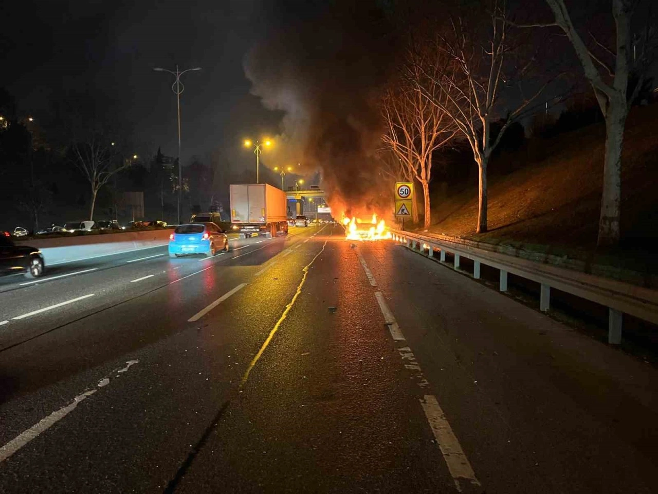 <div>İstanbul Avrupa Otoyolu Bağcılar mevkiinde seyir halindeki hafif ticari araç alev alev yandı. Yangın sebebiyle trafik yoğunluğu oluştu.</div><div>Olay, saat 22.40 sıralarında Avrupa Otoyolu Bağcılar mevkiinde meydana geldi. İddiaya göre, Ankara istikametine giden Ramazan Yayla kontrolündeki 34 FKM 17 plakalı hafif ticari aracın motoru yanmaya başladı. Aracı emniyet şeridine çeken Yayla ve eşi araçtan çıkarken, alevler kısa sürede büyüdü. Yangın sebebiyle otoyolda trafik yoğunluğu oluştu. Yanan araç alev topuna dönerken, ihbar üzerine olay yerine polis, itfaiye ve sağlık ekipleri sevk edildi. Patlamaların meydana geldiği araç itfaiye ekiplerinin müdahalesi ile söndürülürken, kullanılamaz hale geldi. Olayda ölen ya da yaralanan olmadı.</div><div></div><div><b>Kaynak:</b> IHA</div>