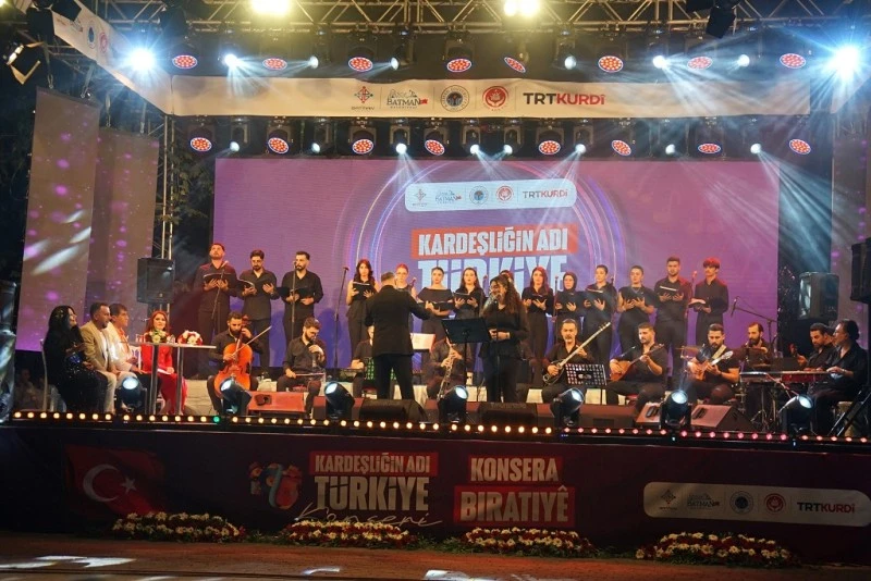 <div>Batman Atatürk Parkı, 19 Ağustos 2025 akşamı müzikle coştu. Batman Valiliği, Batman Üniversitesi ve Batman Belediyesi’nin ortaklaşa düzenlediği “Kardeşliğin Adı Türkiye” temalı konser, çok sayıda katılımcıyı bir araya getirdi.</div> <div>Konseri Batman Valisi ve Belediye Başkan Vekili Ekrem Canalp ile eşi Dr. Ayten Canalp, Batman Üniversitesi Rektörü Prof. Dr. İdris Demir ve eşi Zeynep Demir, TRT Kurdi Kanal Koordinatörü Kemal Gümüş, vali yardımcıları, rektör yardımcıları, kamu kurumları yöneticileri, akademisyenler ve vatandaşlar izledi.</div> <div></div> <div>TRT Kurdî ekranlarından canlı yayınlanan etkinliğin sanat yönetmenliğini Batman Üniversitesi Güzel Sanatlar Fakültesi öğretim üyesi Dr. Yiğit Karabulut üstlendi. Konserde, Aydın Aydın, Hazal Ceylan ve Recep Tanyıldız gibi sevilen sanatçılar sahne aldı. 24 parçalık repertuvar, hareketli ezgilerden duygusal performanslara kadar geniş bir yelpazeye yayıldı.</div> <div>Genç solistler Semanur Nurbaki, Aleyna Aylin Karaboğa, Nisan Kalkan, Yeşimnur Şahin, Abdullah İlhan, Melek Dayan ve İrem Tahtacı, koro performanslarıyla izleyicilerden büyük alkış topladı. Düet performanslarda ise Emre Almaz, Barış Bozkurt, Semanur Nurbaki ve Berat Erpolat sahneye renk kattı.</div> <div>Batman Üniversitesi Rektörü Prof. Dr. İdris Demir, konserin “Terörsüz Türkiye” hedefi doğrultusunda anlamlı olduğunu vurguladı. Demir, “Evlatlarımız, müziğin evrensel diliyle kardeşlik ve beraberlik mesajı verdiler. Anadolu’nun farklı coğrafyalarındaki ezgileri tüm Türkiye’ye yaymayı amaçlıyoruz” dedi.</div> <div>Konser, Türkçe, Kürtçe ve Süryanice halk ezgilerinin seslendirildiği performansların ardından hatıra fotoğrafıyla sona erdi.</div>