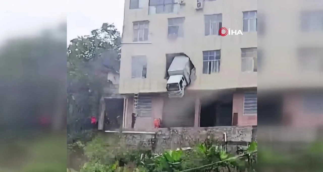 <div>Çin’in Hubei eyaletinde yer alan Hefeng’te kontrolden çıkan kamyon, yol kenarındaki bir binaya çarptı. Bina duvarını yıkarak içeri giren kamyon, binanın diğer tarafından çıktı.</div> <div>Kamyon, kot farkı nedeniyle ikinci katta asılı kaldı. Kazada ölen ya da yaralanan olmazken, sürücü itfaiye ekipleri tarafından kamyonun sabitlenmesinin ardından kurtarıldı.</div> <div>Kazayla ilgili soruşturma başlatıldı.</div> <div><strong>Kaynak:</strong> IHA</div>
