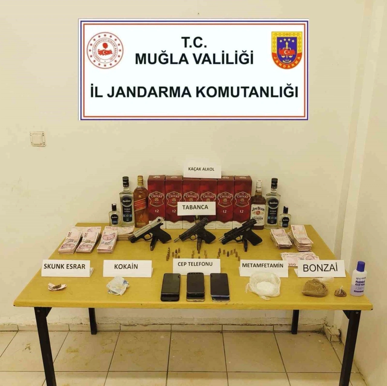 <div>Muğla’nın Bodrum ilçesinde jandarma ekiplerince düzenlenen operasyonda uyuşturucu madde, ruhsatsız silah ve yüklü miktarda nakit para ele geçirildi. Gözaltına alınan 3 şüpheliden 2’si tutuklandı.</div> <div></div> <div>Bodrum İlçe Jandarma Komutanlığı ekipleri, Turgutreis Mahallesi’nde B.A., Ş.C. ve N.G. isimli şahısların ikametlerine operasyon düzenledi. Yapılan aramalarda 65 gram bonzai, 35 gram metamfetamin, 7 gram kokain, 5 gram skunk ve 1 gram esrar ele geçirildi. Ayrıca 3 ruhsatsız tabanca, 12 şişe bandrolsüz içki, 83 bin TL nakit para ve 8 cep telefonu bulundu.</div> <div></div> <div>Gözaltına alınan şüpheliler, jandarmadaki işlemlerinin ardından adliyeye sevk edildi. Bodrum Cumhuriyet Başsavcılığı tarafından yürütülen soruşturma kapsamında, şüphelilerden 2’si tutuklanarak cezaevine gönderildi, 1 kişi ise serbest bırakıldı.</div> <div></div> <div><strong>Kaynak:</strong> IHA</div>