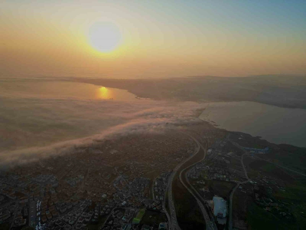<div>İstanbul’da etkili olan sis nedeniyle Büyükçekmece’de gün batımı kartpostallık manzara oluşturdu. İlçenin büyük bir kısmını kaplayan kızıla bürünen bulutlar havadan görüntülendi.</div><div>Şehrin tüm bölgelerinde etkisini gösteren sis, sabah saatlerinde görüş mesafesini düşürerek sürücülerin zor anlar yaşamasında neden oldu. Boğaz, görüş mesafesinin düşmesi ile çift yönlü olarak gemi trafiğine kapatıldı. Öğleden sonra dağılan sis gün batımında Büyükçekmece’de havadan görüntülendi. Çekilen görüntülerde kızıla bürünen bulutlar ilçenin büyük bir kısmını kapladı. Büyükçekmece Endem TV kulesi ise arkasındaki sis manzarası ile kartpostallık kareler oluşturdu.</div><div></div><div><b>Kaynak:</b> IHA</div>