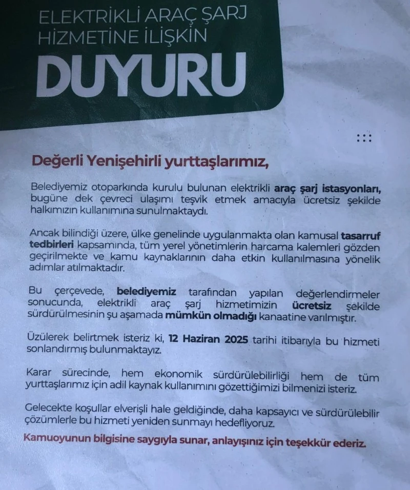 <div>Çevreci ulaşımı teşvik etmek amacıyla bugüne kadar ücretsiz sunulan elektrikli araç şarj hizmeti, Diyarbakır merkez Yenisehir ilçe Belediyesi tarafından durduruldu. Belediye, kararın gerekçesi olarak ülke genelinde yürürlükte olan "kamusal tasarruf tedbirlerini" gösterdi. Ancak vatandaşlar, kararın arkasındaki asıl nedenin ekonomik yönetimdeki plansızlık ve önceliklerin yanlış belirlenmesi olduğunu düşünüyor.</div> <div>Belediyenin otoparkında kurulu olan şarj istasyonları, uzun süredir çevre dostu araç sahiplerine ücretsiz hizmet veriyordu. Ancak yapılan son değerlendirmeler sonucunda, bu hizmetin ücretsiz devam ettirilmesinin "mümkün olmadığı" bildirildi.</div> <div>Yetkililer, 12 Haziran 2025 tarihi itibarıyla uygulamanın sona erdiğini duyururken, "gelecekte koşulların elverişli hale gelmesi durumunda hizmetin yeniden başlatılabileceği" şeklinde bir temennide bulundu.</div> <h3><strong>Vatandaşlardan Tepki: “Tasarruf Vatandaştan Başlıyor”</strong></h3> <div>Belediyenin aldığı karar, özellikle elektrikli araç kullanıcılarının tepkisini çekti. Birçok vatandaş sosyal medyada, “Tasarruf neden yine vatandaştan başlıyor?”, “Çevreci projeler ilk feda edilen kalem mi oldu?” şeklinde eleştirilerde bulundu.</div> <div>Özellikle son dönemde elektrikli araç sayısının arttığı Yenisehir’de, bu kararın ulaşım alışkanlıklarını olumsuz etkileyebileceği belirtiliyor.</div> <h3><strong>Belediyeden Gerekçe: “Kamu Kaynaklarının Etkin Kullanımı”</strong></h3> <div>Belediye açıklamasında ise, “Tüm yerel yönetimlerin harcama kalemleri gözden geçiriliyor. Kamu kaynaklarının daha etkin kullanılması için böyle bir adım atıldı” denildi.Ancak ekonomik sürdürülebilirlik adına yapılan bu kesinti, birçok kişi tarafından sosyal belediyecilik anlayışına ters düştüğü gerekçesiyle eleştiriliyor.</div> <h3><strong>Yeniden Hizmet Umudu Var mı?</strong></h3> <div>Belediye, ileride daha sürdürülebilir ve kapsayıcı çözümler geliştirmeyi hedeflediklerini belirtti. Ancak birçok vatandaş, hizmetin ne zaman ve hangi koşullarda yeniden başlayacağı konusunda net bir tarih verilmemesinden rahatsız.</div> <h3><strong>İşte belediyenin o açıklaması</strong></h3> <div><strong></strong></div>