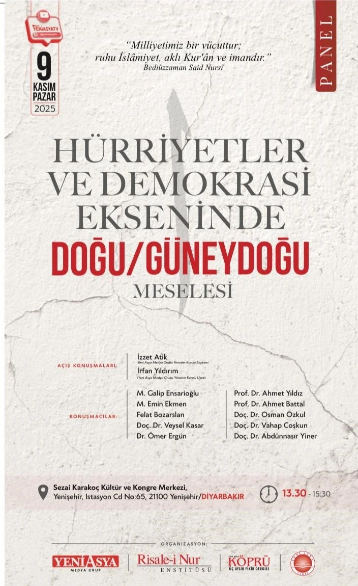 <div>Yeni Asya Eğitim, Kültür ve Araştırma Vakfı bünyesindeki <strong>Risale-i Nur Enstitüsü</strong>, Diyarbakır’da önemli bir akademik programa ev sahipliği yapmaya hazırlanıyor. “<strong>Hürriyetler ve Demokrasi Ekseninde Doğu/Güneydoğu Meselesi</strong>” başlıklı program, <strong>9 Kasım Pazar günü saat 13.30’da</strong> Sezai Karakoç Kültür ve Kongre Merkezi’nde gerçekleştirilecek.</div> <h3>“Milliyetimiz bir vücuttur; ruhu İslamiyet, aklı Kur’an ve imandır”</h3> <div>Panelin afişinde Bediüzzaman Said Nursî’nin “<strong>Milliyetimiz bir vücuttur; ruhu İslamiyet, aklı Kur’an ve imandır</strong>” sözüne yer verilerek, programın manevi ve düşünsel çerçevesine dikkat çekildi.</div> <div>Yeni Asya Medya Grubu’nun organizasyonunda düzenlenecek panelde, bölgedeki özgürlükler, demokratikleşme, kardeşlik ve toplumsal barış konuları geniş bir perspektifle tartışılacak.</div> <h3>Akademik kadro ve konuşmacılar dikkat çekiyor</h3> <div>Programın açılış konuşmalarını <strong>Yeni Asya Medya Grubu Yönetim Kurulu Başkanı İzzet Atik</strong> ve <strong>Yeni Asya Medya Grubu Yönetim Kurulu Üyesi İrfan Yıldırım</strong> yapacak.</div> <div>Panelde konuşmacı olarak şu isimler yer alacak:<strong>M. Galip Ensarioğlu, M. Emin Ekmen, Felat Bozarslan, Doç. Dr. Veysel Kasar, Dr. Ömer Ergün, Prof. Dr. Ahmet Yıldız, Prof. Dr. Ahmet Battal, Doç. Dr. Osman Özkul, Doç. Dr. Vahap Coşkun</strong> ve <strong>Doç. Dr. Abdünnasir Yiner.</strong></div> <div>Bu isimlerin bölgenin sosyal yapısı, eğitim, demokrasi, insan hakları ve adem-i merkeziyet gibi konular üzerine önemli değerlendirmelerde bulunmaları bekleniyor.</div> <h3>“Bediüzzaman dikkate alınmadan süreç eksik kalır”</h3> <div>Risale-i Nur Enstitüsü Sekreteryası, panelin ana çerçevesinin Bediüzzaman Said Nursî’nin görüşleriyle şekillendirildiğini vurgulayarak şu açıklamayı yaptı:</div> <div>“Bu coğrafyada yetişmiş bir İslam âlimi olarak, Bediüzzaman Said Nursî bölgenin iç dinamiklerini iyi bilmiş ve çözüm yolları önermiştir. Onun dikkate alınmadığı bir süreç eksik kalır. Bediüzzaman’ın ‘cehalet, zaruret, ihtilaf’ hastalıklarına karşı sunduğu ‘sanat, marifet, ittifak’ reçetesi hâlâ geçerliliğini korumaktadır.”</div> <div>Açıklamada ayrıca, Bediüzzaman’ın “<strong>Medresetüzzehra</strong>” projesinin yalnızca bölge değil, tüm İslam coğrafyası için bir <strong>medeniyet vizyonu</strong> olduğu ifade edildi.</div> <h3>Yeni Asya TV’den canlı yayınlanacak</h3> <div>Panel, <strong>Yeni Asya TV</strong> üzerinden canlı yayınlanacak. Etkinliğin, Diyarbakır halkının yanı sıra bölgedeki sivil toplum kuruluşları, akademisyenler ve gençlerin yoğun ilgisini çekmesi bekleniyor.</div> <div>Risale-i Nur Enstitüsü yetkilileri, Diyarbakırlıları programa davet ederek, etkinliğin “<strong>kardeşlik ikliminin güçlenmesine vesile olmasını</strong>” temenni etti.</div> <div></div>