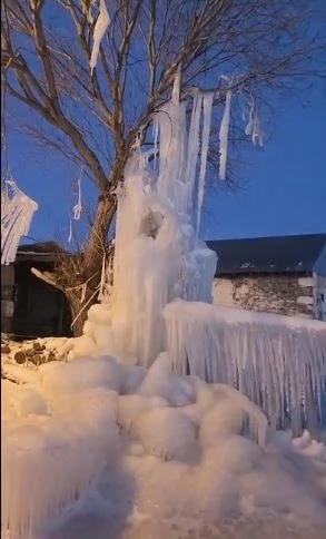 <div>Dondurucu soğukların etkili olduğu Ardahan’da meydana gelen su patlağı, kısa sürede ilginç görüntülere sahne oldu.</div> <div></div> <div>Ardahan merkeze bağlı Çimenkaya köyü ile Uzunova köyü arasında patlayan su hattından fışkıran su, hava sıcaklığının sıfırın altında seyretmesi nedeniyle donarak dev bir buz kütlesi oluşturdu. Ortaya çıkan görüntü, adeta buzdan bir heykeli andırırken vatandaşların da ilgisini çekti.</div> <div></div> <div>Yetkililer, benzer olumsuzluklara karşı dikkatli olunması yönünde uyarılarda bulundu.</div> <div>KAYNAK : İHA</div>