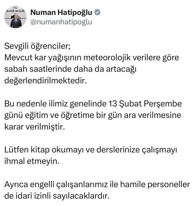 <div>Elazığ’da kar yağışı nedeniyle kent genelinde eğitime 1 gün ara verildi.</div><div>Elazığ Valisi Numan Hatipoğlu sosyal medya hesabından yaptığı açıklamada, "Mevcut kar yağışının meteorolojik verilere göre sabah saatlerinde daha da artacağı değerlendirilmektedir. Bu nedenle ilimiz genelinde 13 Şubat Perşembe günü eğitim ve öğretime bir gün ara verilmesine karar verilmiştir. Lütfen kitap okumayı ve derslerinize çalışmayı ihmal etmeyin. Ayrıca engelli çalışanlarımız ile hamile personeller de idari izinli sayılacaklardır" ifadelerini kullandı.</div><div><b>Kaynak:</b> IHA</div>