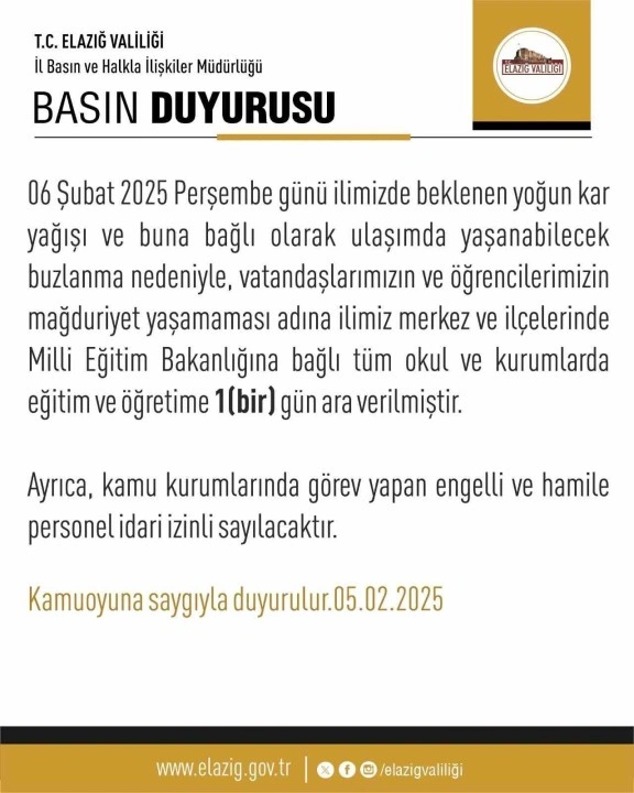 <div>Elazığ’da şehir merkezinin ardından ilçelerde de eğitime bir gün ara verildi.</div><div>Elazığ Valiliği’nde yapılan açıklamada, "6 Şubat 2025 Perşembe günü ilimizde beklenen yoğun kar yağışı ve buna bağlı olarak ulaşımda yaşanabilecek buzlanma nedeniyle, vatandaşlarımızın ve öğrencilerimizin mağduriyet yaşamaması adına ilimiz merkez ve ilçelerinde Milli Eğitim Bakanlığına bağlı tüm okul ve kurumlarda eğitim ve öğretime 1 (bir) gün ara verilmiştir. Ayrıca, kamu kurumlarında görev yapan engelli ve hamile personel idari izinli sayılacaktır" denildi.</div><div><b>Kaynak:</b> IHA</div>