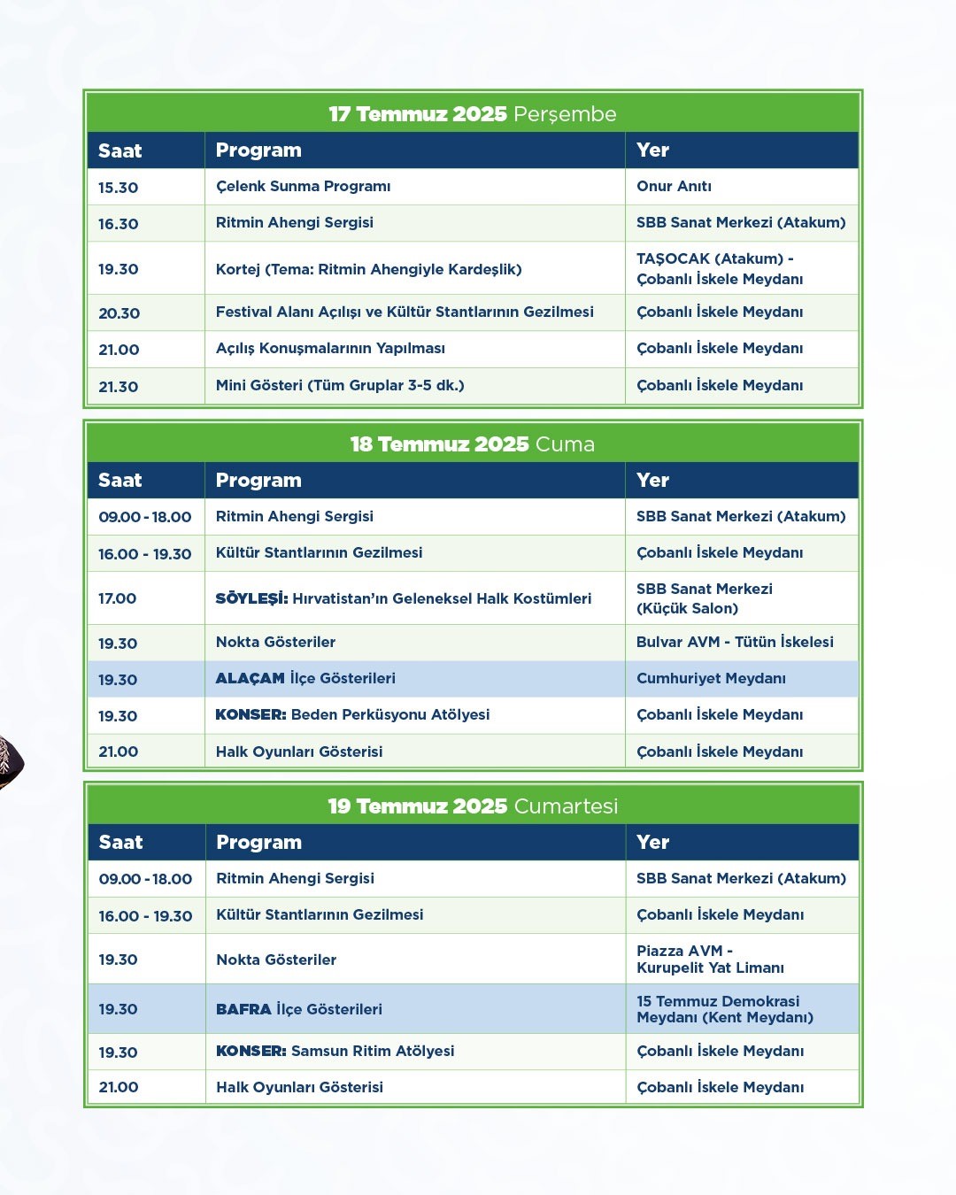 <div>Samsun Büyükşehir Belediyesi şehri kültür ve sanatla buluşturmaya devam ediyor. Kentte heyecanla beklenen ve Büyükşehir Belediyesi tarafından düzenlenen 35. Uluslararası "Halk Oyunları Festivali" yarın (17 Temmuz Perşembe) başlıyor. Festivalin ilk günkü programı kapsamında ilk olarak 15.30’da Onur Anıtı’na Çelenk sunumu yapılacak. 16.30’da ise Büyükşehir Belediyesi Sanat Merkezi "Ritmin Ahengi" sergisine ev sahipliği yapacak.</div> <div></div> <div>Ana gösteri merkezi Çobanlı İskelesi</div> <div></div> <div>19.30’da Türk-İş’ten Çobanlı İskelesine kortej yürüyüşü gerçekleştirilecek. 20.30 itibariyle ise festivalin resmi açılış programı gerçekleştirilecek. "Ritmin ahengiyle kardeşlik" sloganı ile bu yıl 35’incisi düzenlenen Uluslararası Halk Oyunları Festivali 9 gün sürecek ve her gün birbirinden farklı etkinliklerle kentte kültür sanat coşkusu yaşatacak. Türkiye, Kuzey Kıbrıs Türk Cumhuriyeti, Hırvatistan, Kuzey Osetya, Arjantin, Meksika, İran, Bulgaristan, Rusya, Moldova, Sırbistan, Karadağ, Letonya’nın geleneksel dansları, oyunları ve kültürleri Samsunlularla buluşacak.</div> <div></div> <div>6 ilçede program</div> <div></div> <div>Festival havasını tüm ilçelere yaymak adına Alaçam, Bafra, Vezirköprü, Çarşamba, Terme ve Havza’da da festival programları düzenlenecek. İlçeler dışında şehrin birçok noktasında programlar düzenlenerek kentin tamamında festival coşkusunun yaşanması sağlanacak.</div> <div></div> <div>Başkan Doğan’dan davet</div> <div></div> <div>Samsun Büyükşehir Belediye Başkanı Halit Doğan, "Samsun’umuz dünyanın buluşma noktası olmaya devam ediyor. "Ritmin ahengiyle kardeşlik" sloganı ile bu yıl 35’incisi düzenlenen Uluslararası Halk Oyunları Festivalimiz yarın başlıyor. Tüm hemşehrilerimizi festival alanlarına davet ediyor, şehrimizin kültür sanattaki güzelliğini yansıtmaya katkı sunmaya bekliyoruz. Çobanlı İskelesi ana gösteri merkezi olacak ama onun ışında ilçelerimizde ve farklı birçok noktada programlar olacak. Tam bir kültür-sanat şölenini hep birlikte yaşayacağız. Ev sahipliği yapmaktan gurur ve mutluluk duyduğumuz 35. Uluslararası Halk Oyunları Festivali’nin bir kez daha şehrimize hayırlı olmasını diliyorum" dedi.</div> <div></div> <div></div> <div><strong>Kaynak:</strong> IHA</div>