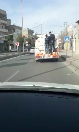 Şanlıurfa’da yakıt tankerine tutunan 2 gencin tehlikeli yolculuğu kameralara yansıdı. Edinilen bilgiye göre, Şanlıurfa’nın Eyyübiye ilçesinde seyir halindeki yakıt tankerine tutunan 2 gencin tehlikeli yolculuğu görenleri yüreklerini ağızlara getirdi. Akçakale yolu üzerinde seyir halinde olan yakıt tankerinin arkasına tutunarak yolculuk eden 2 genci gören bir sürücü bu tehlikeli yolculuğu cep telefonuyla kaydetti. Trafikte ilerleyen tanker, yoluna devam ederken kaydı alan sürücü ise başka bir yola saptı. Yolculuğun nerede ve nasıl sonuçlandığı ise öğrenilemedi.
