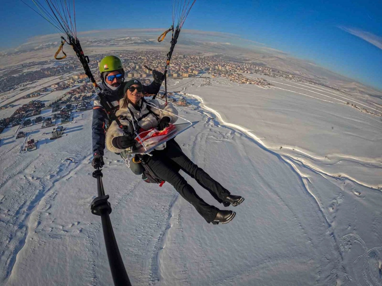 <div>Palandöken’in 3100 rakımlı zirvesinde yamaç paraşütü ile süzülen Neşe Durdi ve Yusuf Okuyucu, Erzurum’un coğrafi işaretli yemeği olan cağ kebabını tadını çıkardılar.</div><div>Kilometrelerce sürüp giden pistleri ve toz kar özelliği sayesinde kayak sezonu boyunca kayak severlere mükemmel kalitede kar sunan Palandöken’de heyecan dolu alternatif aktiviteler de yapılıyor. Bunlardan biri de son yıllarda yaygın hale gelen yamaç paraşütü oldu.</div><div>Palandöken’in zirvesinden aşağı süzüldüler</div><div>Palandöken’in muhteşem manzarasının tadını yamaç paraşütü yaparken çıkarmak isteyen adrenalin tutkunları, bu anları kaydedip insanlarla paylaşmayı da ihmal etmiyor. Yamaç paraşütü heyecanını ve deneyimini ilk kez yaşayan Neşe Durdi, adrenalin tutkusunu biraz daha ileri taşıdı. 3100 rakımlı Palandöken Dağı zirvesinden yamaç paraşütü hocası Yusuf Okuyucu ile bu deneyimi yaşayan Neşe Durdi, yanında getirdiği cağ kebabını gökyüzünde süzülerek yedi.</div><div>"-40 derece bile engel olmadı"</div><div>"Aslen Erzurumlu olan ve her yıl İstanbul’dan memleketindeki dedesini görmeye geldiğini anlatan Neşe Durdi, "Palandöken’in eşsiz pistlerinde kayak yaparken yamaç paraşütü yapıldığını fark ettim. Bu beni çok heyecanlandırdı. Hayalini kurduğum yamaç paraşütünü, Erzurum’un en özel yemeği ve tadı olan cağ kebabıyla birleştirmek istedim. Yaklaşık 10 bin fitte özgürce yaşadığımız heyecan ve güzellikler dolu yolculuğa -40 derece hava bile engel olamadı. Ülkemde Palandöken gibi eşsiz doğal güzellikleri olan bir yere sahip olmak beni çok mutlu ediyor. Herkesi bu güzellikleri ve Palandöken’i yaşamaya davet ediyorum" dedi.</div><div></div><div><b>Kaynak:</b> IHA</div>