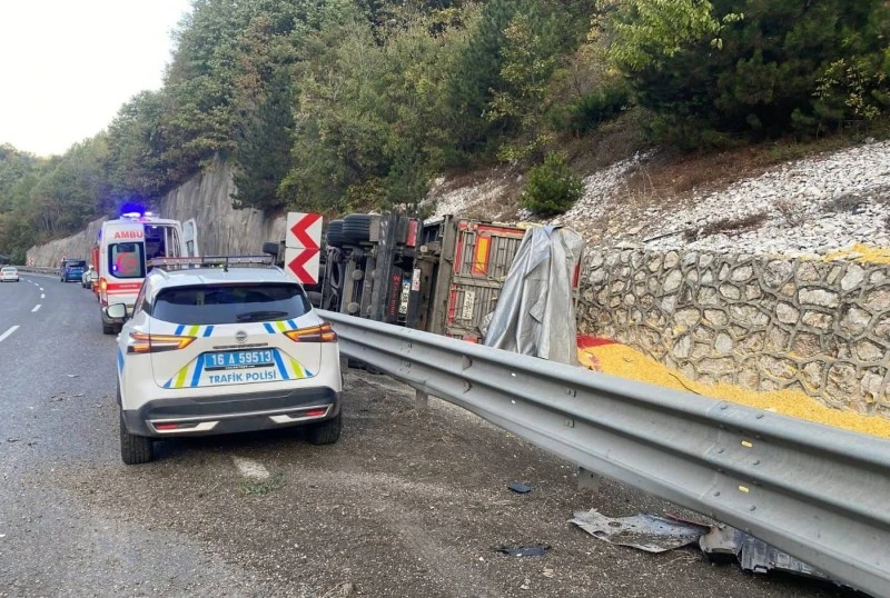 <h4 data-end="706" data-start="503">Bursa-Ankara karayolunun İnegöl Mezit Boğazı mevkiinde sabah saatlerinde meydana gelen kazada, yem yüklü bir TIR devrildi. Kazada, TIR sürücüsü Ahmet S. (32) ile eşi Saliha S. (34) yaralandı.</h4> <div></div> <div data-end="966" data-start="708">Olay, saat 07.30 sıralarında Konya’dan Bursa istikametine doğru seyir halinde olan 42 ERG 17 plakalı TIR’ın virajda kontrolden çıkmasıyla yaşandı. Sürücüsünün direksiyon hakimiyetini kaybetmesi sonucu araç, yol kenarındaki istinat duvarına çarparak devrildi.</div> <div data-end="1218" data-start="968">Çevredekilerin ihbarı üzerine bölgeye sağlık ve jandarma ekipleri sevk edildi. Kazada yaralanan sürücü ile eşi, olay yerinde yapılan ilk müdahalenin ardından İnegöl Devlet Hastanesi’ne kaldırıldı. Yaralıların sağlık durumlarının iyi olduğu öğrenildi.</div> <div data-end="1345" data-start="1220">Kaza nedeniyle karayolunda ulaşım bir süre kontrollü olarak sağlanırken, Jandarma ekipleri olayla ilgili soruşturma başlattı.</div> <div data-end="1345" data-start="1220"></div> <div data-end="1345" data-start="1220">KAYNAK: İHA</div>