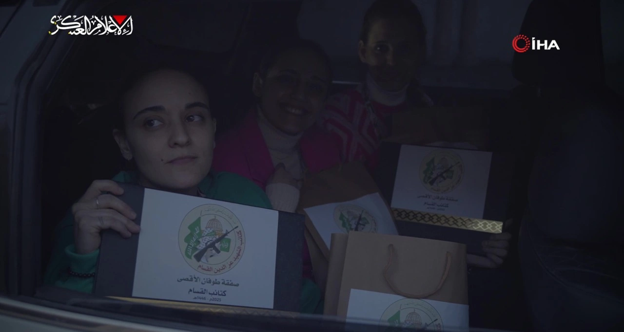 <div>Hamas'ın askeri kanadı İzzeddin El Kassam Tugayları, Gazze Şeridi'nde ateşkes ve esir takası anlaşması kapsamında serbest bıraktığı 3 İsrailli esirin görüntülerini yayınladı. Görüntülerde, Romi Gonen, Emily Damari ve Doron Steinbrecher adlı esirlerin Kassam Tugayları üyeleri ile konvoy halinde Kızılhaç'a teslim edilecekleri noktaya getirildikleri görüldü.Görüntülerde, Kassam Tugayları'nın esirlere üzerinde "Tutuklunun serbest bırakılması kararı" yazılı sertifika ve "hediye çantaları" verdiği görüldü. İsrail basını, çantalarda esirlerin Hamas tarafından çekilen fotoğraflarının olduğunu iddia etti.</div><div><b>Kaynak:</b> IHA</div>