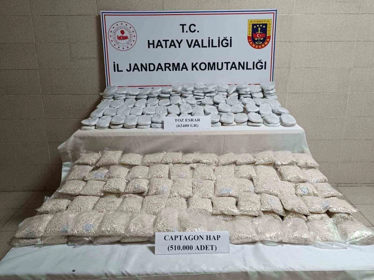 <div>Hatay’da Suriye uyruklu 2 şahsın ülkeye kaçak yollarla soktuğu 87 kilo 990 gram captagon hap ve 62 kilo 400 gram toz esrar ele geçirildi.</div><div>Hatay’da jandarma komutanlığı ekipleri uyuşturucu tacirlerine yönelik çalışmalarını aralıksız sürdürüyor. Jandarma ekipleri tarafından, Altınözü ilçesinde Suriye uyruklu 2 şahsın ülkeye kaçak yollarla soktuğu 510 bin adet 87 kilo 990 gram captagon hap ve 62 kilo 400 gram toz esrar ele geçirildi. Yakalama çalışmaları sonucunda 2 şüpheli hakkında gerekli yasal işlemlere başlandı.</div><div><b>Kaynak:</b> IHA</div>