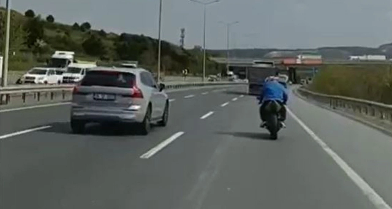 <div>İstanbul Havalimanı-Kemerburgaz yolu üzerinde geçtiğimiz günlerde plakasını söken bir motosiklet sürücüsü, otobanda dakikalarca tehlikeli bir sürüş gerçekleştirdi. Motosiklet sürücüsünün makas attığı, ön tekeri kaldırdığı ve emniyet şeridini işgal ettiği anları, bir vatandaş cep telefonu kamerasıyla kaydetti. Akan trafikte hem kendi canını hem de diğer araç sürücülerinin hayatını tehlikeye atan sürücü, yüreklere ağza getirdi.</div> <div><strong>Kaynak:</strong> IHA</div>