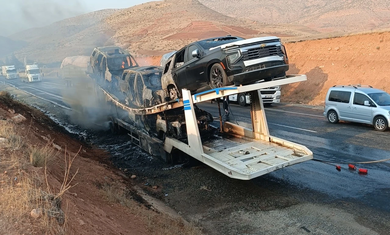 <div>Batman’ın Hasankeyf ile Gercüş ilçeleri arasındaki Aykar köyü yakınlarında seyir halinde olan İran plakalı bir tırda, henüz belirlenemeyen bir nedenle yangın çıktı. Tırın dorsesinde yüklü olan 5 adet sıfır kilometre lüks araç, alevlerin kısa sürede yayılmasıyla birlikte tamamen yanarak kullanılamaz hale geldi.</div> <div>Çevredeki sürücülerin durumu fark ederek 112 Acil Çağrı Merkezi’ne haber vermesi üzerine bölgeye çok sayıda itfaiye, jandarma ve sağlık ekibi sevk edildi. Yangın, ekiplerin müdahalesiyle kontrol altına alınarak söndürüldü. Ancak araçlar ve tır tamamen hurdaya döndü.</div> <div>Yangının çıkış nedeni henüz belirlenemezken, olayla ilgili geniş çaplı inceleme başlatıldı.</div>