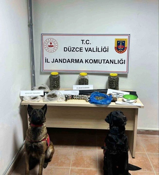 <div>DÜZCE(İHA) – Düzce Cumhuriyet Başsavcılığı koordinesinde jandarma ekipleri tarafından Gümüşova ilçesinde yapılan operasyonda kubar esrar, kenevir tohumu ve 3 adet tüfek ele geçirildi.</div><div>Düzce’de Cumhuriyet Başsavcılığı koordinesinde jandarma ekiplerinin uyuşturucu ile mücadelesi devam ediyor. Gümüşova ilçesi Pazarcık köyünde İlçe Jandarma Komutanlığı ve KOM Şube Müdürlüğü tarafından yapılan araştırma sonucunda bir şahsın uyuşturucu ve uyarıcı madde ticareti yaptığına dair alınan duyumlar çerçevesinde şüpheli şahsın ikametlerinde arama yapıldı. Yapılan aramada 3 kavanoz ve ayrı ayrı poşetler içerisinde toplam bin 335 gram kubar esrar maddesi, 1 adet ruhsatsız tek kırma tüfek, 2 adet ruhsatsız otomatik tüfek, çalışır vaziyette hassas terazi, 6 gram kenevir tohumu, uyuşturucu madde kullanma aparatı ve 16 adet av tüfeğine ait kartuş ele geçirildi. Olayla ilgili uyuşturucu madde ticareti yapma suçundan işlem yapılan 1 şüphelinin gözaltına alındığı bildirildi.</div><div><b>Kaynak:</b> IHA</div>