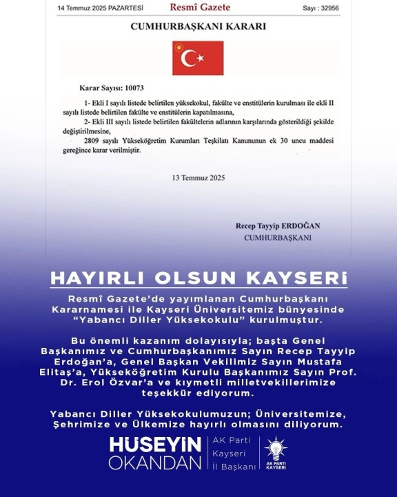 <div>AK Parti Kayseri İl Başkanı Hüseyin Okandan, Kayseri Üniversitesi’nde (KAYÜ) Yabancı Diller Yüksekokulu’nun kurulduğunu duyurdu.</div> <div></div> <div>Başkan Okandan yaptığı paylaşımda; "Resmî Gazete’de yayımlanan Cumhurbaşkanı Kararnamesi ile Kayseri Üniversitemiz bünyesinde ’Yabancı Diller Yüksekokulu’ kurulmuştur. Bu önemli kazanım dolayısıyla; başta Genel Başkanımız ve Cumhurbaşkanımız Sayın Recep Tayyip Erdoğan’a, Genel Başkan Vekilimiz Sayın Mustafa Elitaş’a, Yükseköğretim Kurulu Başkanımız Sayın Prof. Dr. Erol Özvar’a ve kıymetli milletvekillerimize teşekkür ediyorum. Yabancı Diller Yüksekokulumuzun; Üniversitemize, Şehrimize ve Ülkemize hayırlı olmasını diliyorum" ifadelerine yer verdi.</div> <div></div> <div><strong>Kaynak:</strong> IHA</div>